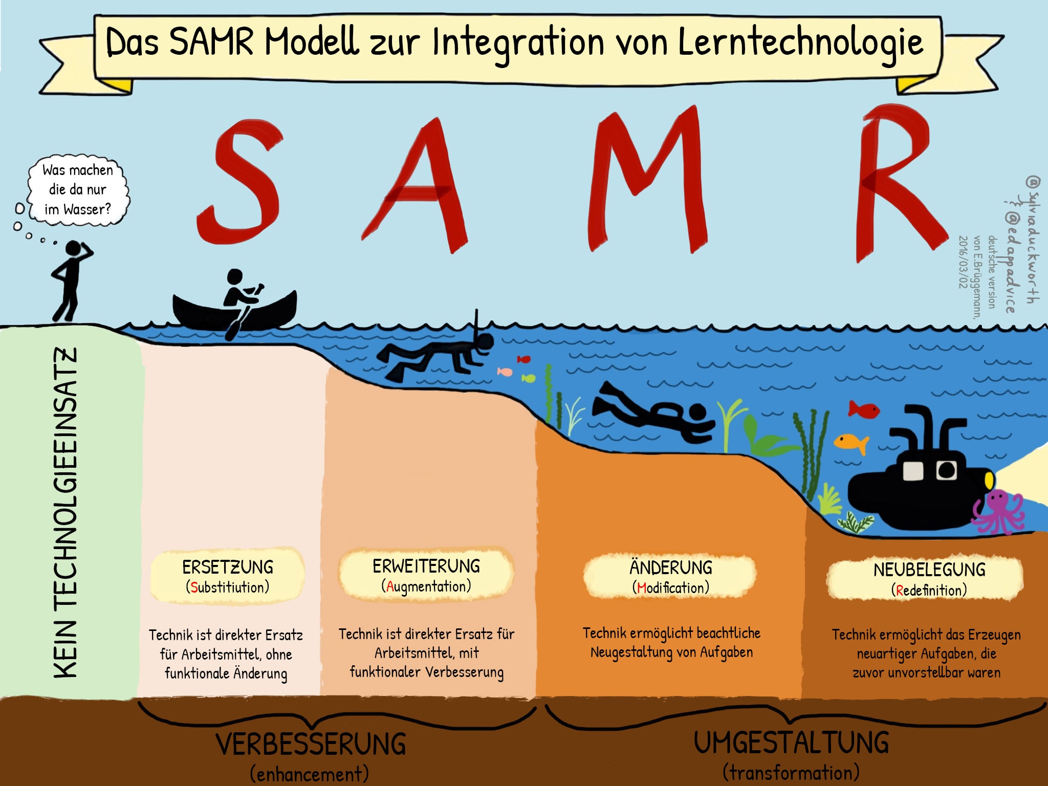 Nutzt man KI mit der ganzen Klasse, ist die Auswahl an Unterrichtsszenarien, welche sich auf einschlägigen Homepages und Social Media Accounts findet, inzwischen grenzenlos. Das alte Prinzip, die Methode habe sich am Unterrichtsinhalt zu orientieren und nicht andersherum sollte auch hier im Fokus bleiben. Bei der Betrachtung des Inhaltes lohnt es sich dann aber, an das SAMR-Modell zur Integration neuer Lerntechnologien zurückzudenken: